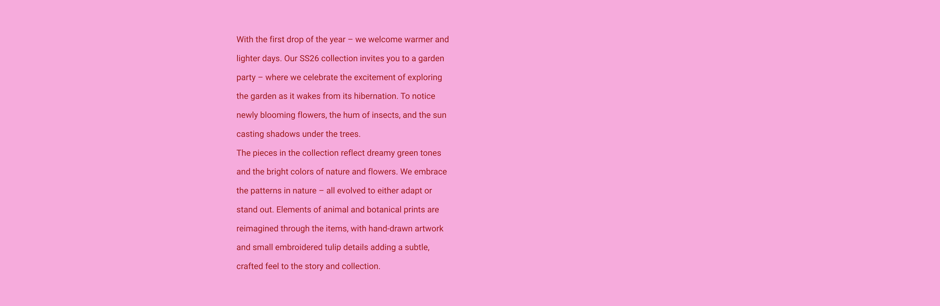 Spring Summer 2026 er en let og sanselig kollektion, hvor materialer, farver og print